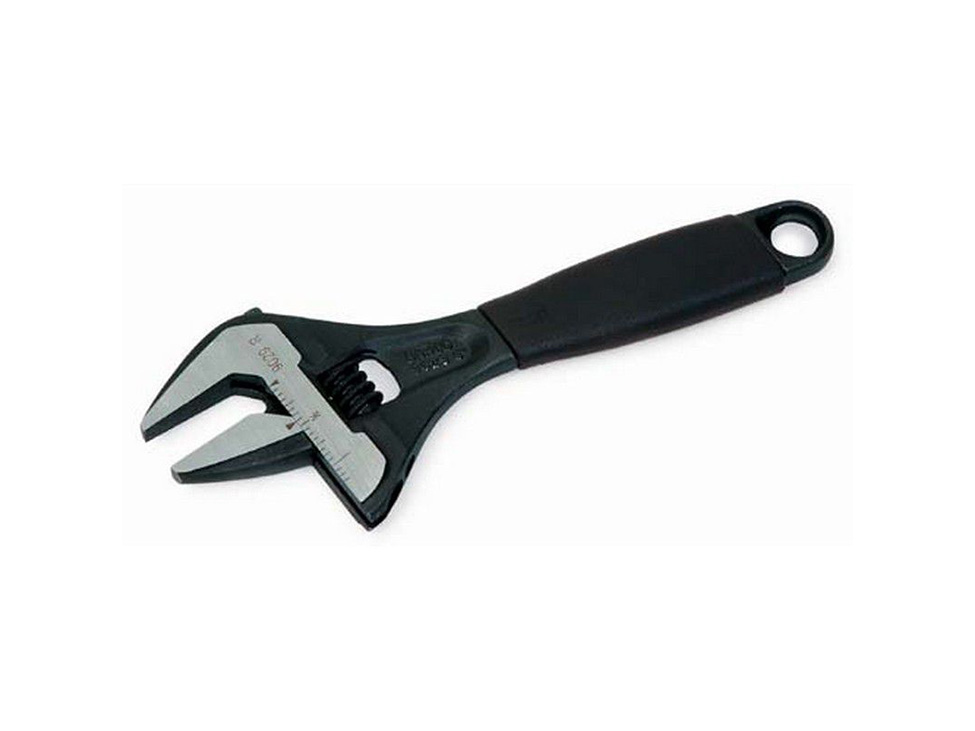 8″ wide mouth comb adjustable pipe wrench with 1-1/2″ jaw. Slim head and tapered jaws provide accessibility and greater turning strength. Thermoplastic handle has a larger grip width. Black phosphate finish.