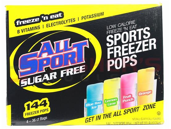 Sugar free sports freezer pops in assorted flavors; with B vitamins, electrolytes and potassium. The 3 oz pops come in four 36-count poly bags (144 pops per case).