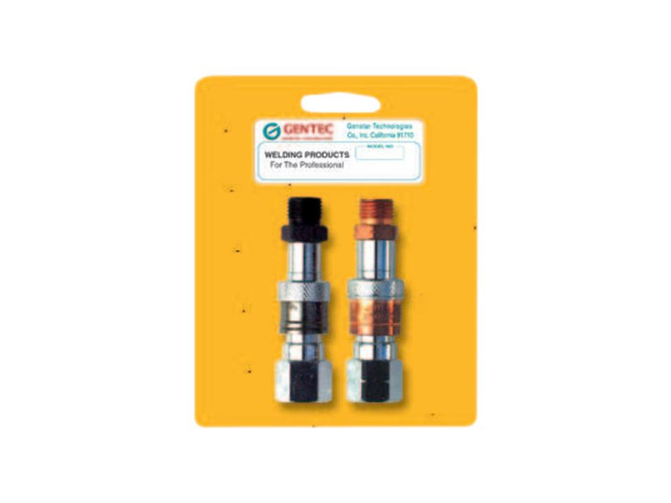 Quick Connector Sets, Regulator-to-Hose Connector Set, 145 psi, Fuel/Oxygen. Built-in automatic reset check valve prevents reverse flow of gases by cutting off the gases under back pressure