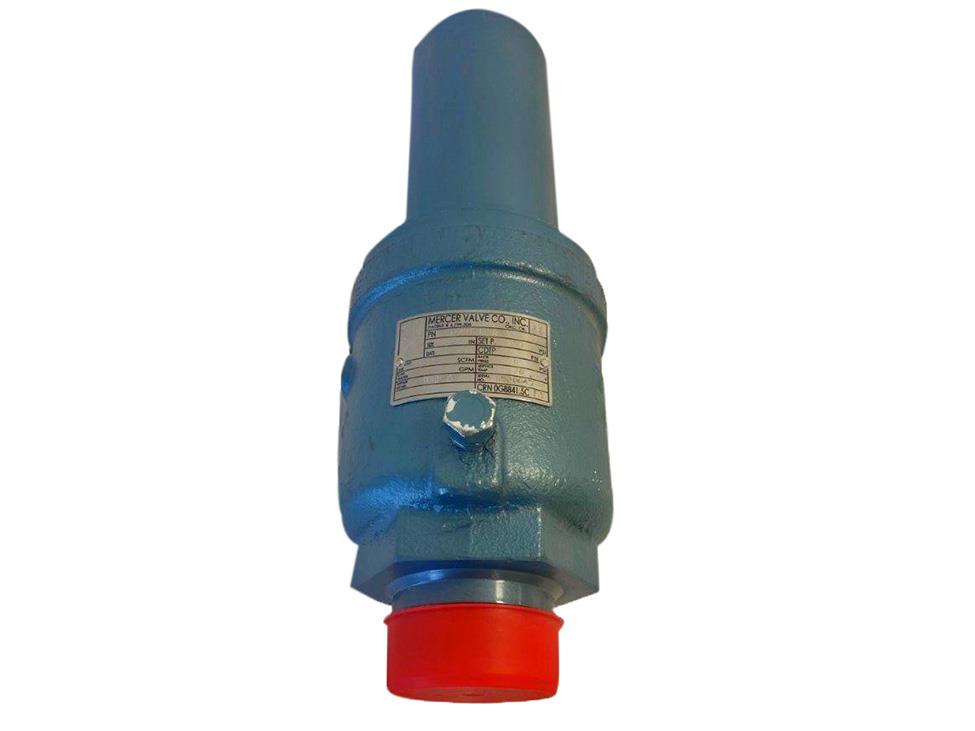 VALVE SAFETY RELIEF 1 IN MALE THREADED X FEMALE THREADED SET AT 200 PSI A216 WCB CAST CARBON STEEL BODY D ORIFICE FKM 90 DURO SEAT 316 STAINLESS STEEL TRIM 316 STAINLESS STEEL DISC FKM / BUNA-N O-RINGS SOUR GAS APPLICATION CLOSED CAP / 316 STAINLESS STEEL NOZZLE SERIES 9100 MERCER VALVE 91-17D51V07NX1-SET200